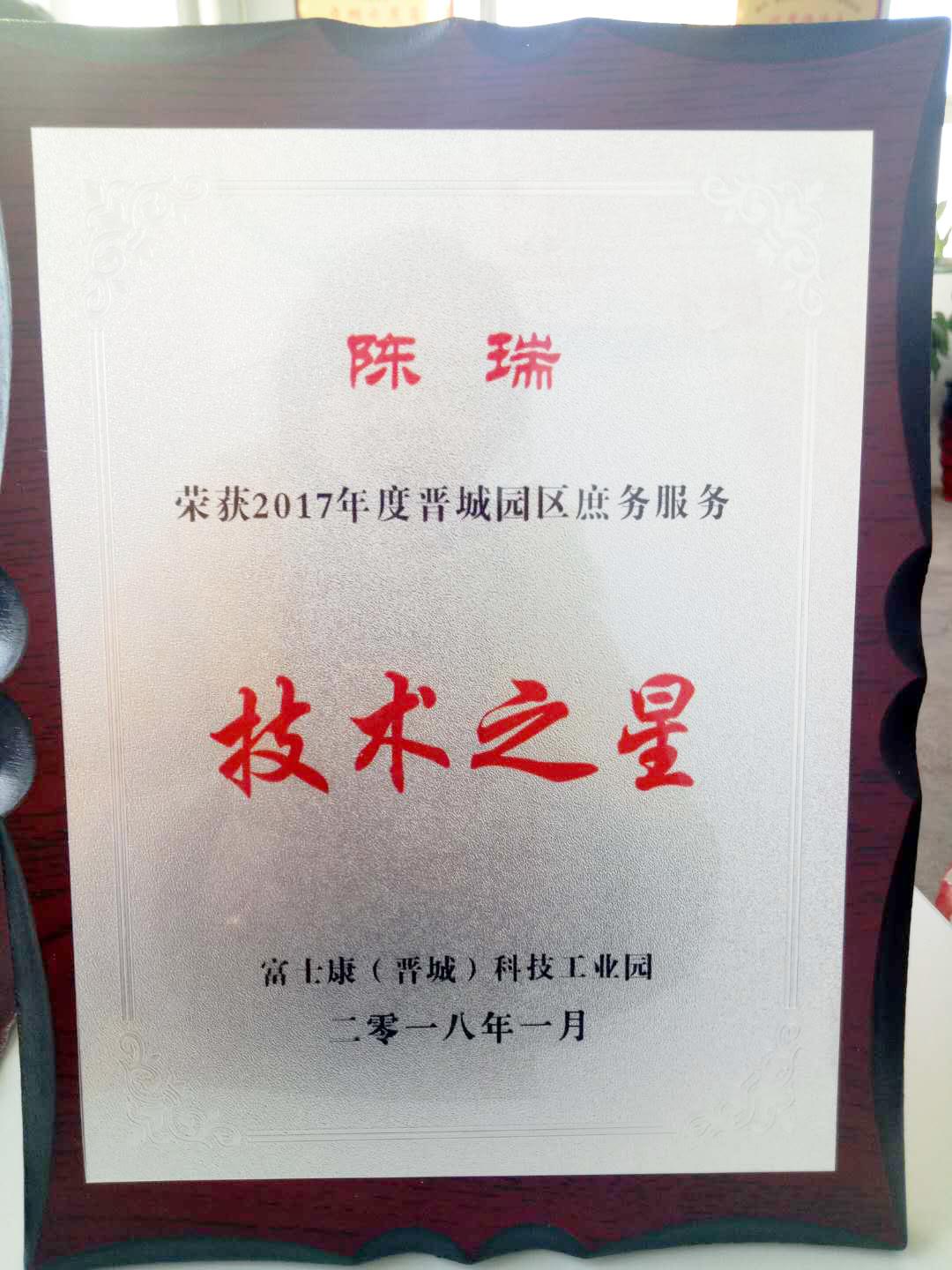 近日,在富士康(晉城)科技工業(yè)園舉辦的2017年度晉城園區(qū)庶務(wù)服務(wù)年終評比中,我公司員工陳瑞榮獲“技術(shù)之星“的稱號,這份榮譽(yù)是陳瑞總結(jié)日常工作所得經(jīng)驗(yàn)再加上自身的刻苦鉆研,勤勞肯干的精神取得的。