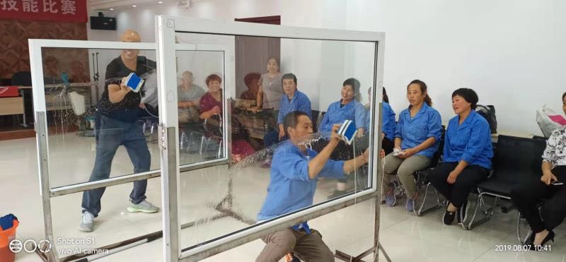 賽前,公司總經(jīng)理程晉軍、工會主席崔偉作了致辭動員。比賽選手個(gè)個(gè)摩拳擦掌,躍躍欲試。首先進(jìn)行的是洗地機(jī)障礙演示技能比賽,比賽過程中每個(gè)選手都能嫻熟地安全避過比賽設(shè)置的障礙并能按正規(guī)操作章程進(jìn)行,展示了過硬的操作技能;在高空外墻清洗安全防范實(shí)際演示過程中,穿工衣、帶安全帽、系安全繩以及放繩整個(gè)過程細(xì)致到位,一氣呵成;接著大家期盼的蒙眼擦玻璃賽將技能比賽推向了高潮,這是最富觀賞性的比賽,大家在佩服選手熟練的手法和技巧時(shí),也對工程部對于服務(wù)質(zhì)量和技術(shù)的高要求感到敬佩。比賽中洋溢著歡歌笑語,公司副總經(jīng)理張永智對比賽進(jìn)行了實(shí)時(shí)精彩的點(diǎn)評。