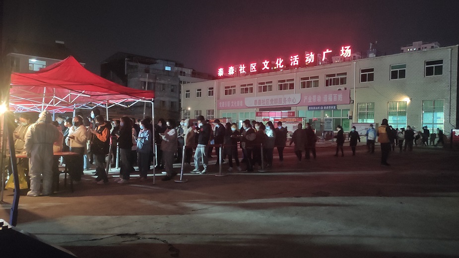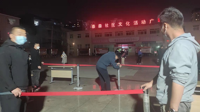 在泰森社區(qū)文化活動(dòng)廣場(chǎng),志愿者們擺桌子、拉警戒線、撐帳篷,齊心合力協(xié)助社區(qū)工作人員完成核酸檢測(cè)采樣點(diǎn)位設(shè)置及物資配備,同時(shí)積極引導(dǎo)社區(qū)居民進(jìn)行掃碼登記、測(cè)量體溫,提醒社區(qū)居民全程佩戴口罩,在排隊(duì)期間保持一米間距,組織居民做好分組,提前亮碼,核酸檢測(cè)完成后有序離場(chǎng)。雖然天氣較冷,但志愿者們毫無(wú)怨言,服務(wù)熱情很高,直至晚上12點(diǎn),協(xié)助社區(qū)完成了9000余人的核酸檢測(cè)工作。