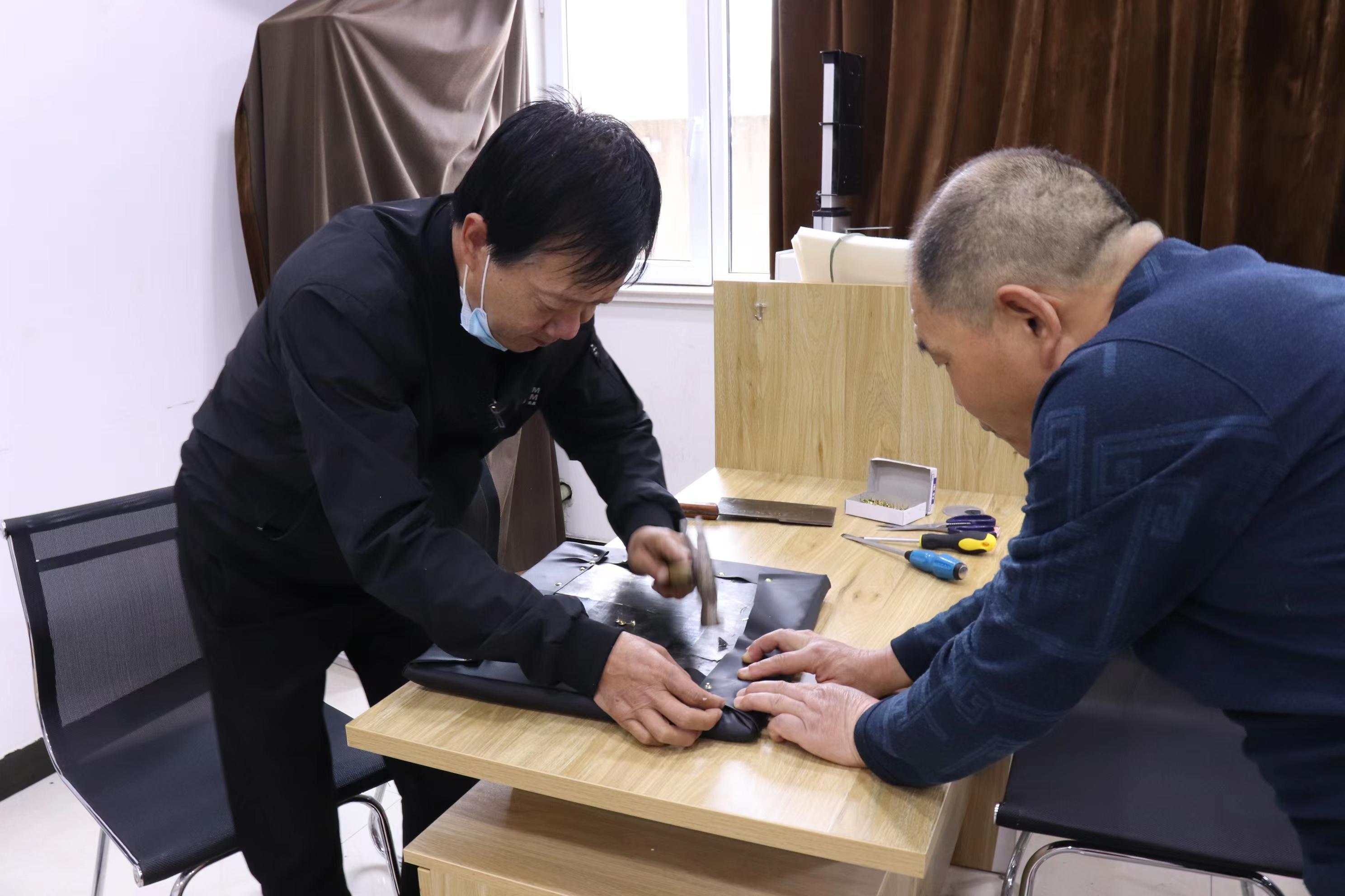 說干就干。他們買來了海綿 、面料 、釘子,憑借衛(wèi)師傅以前的木工技術(shù)和田師傅現(xiàn)有的維修技能,對(duì)破損的椅子進(jìn)行了集中維修。叮叮當(dāng)當(dāng)……敲敲打打,手腳并用,不亦樂乎……