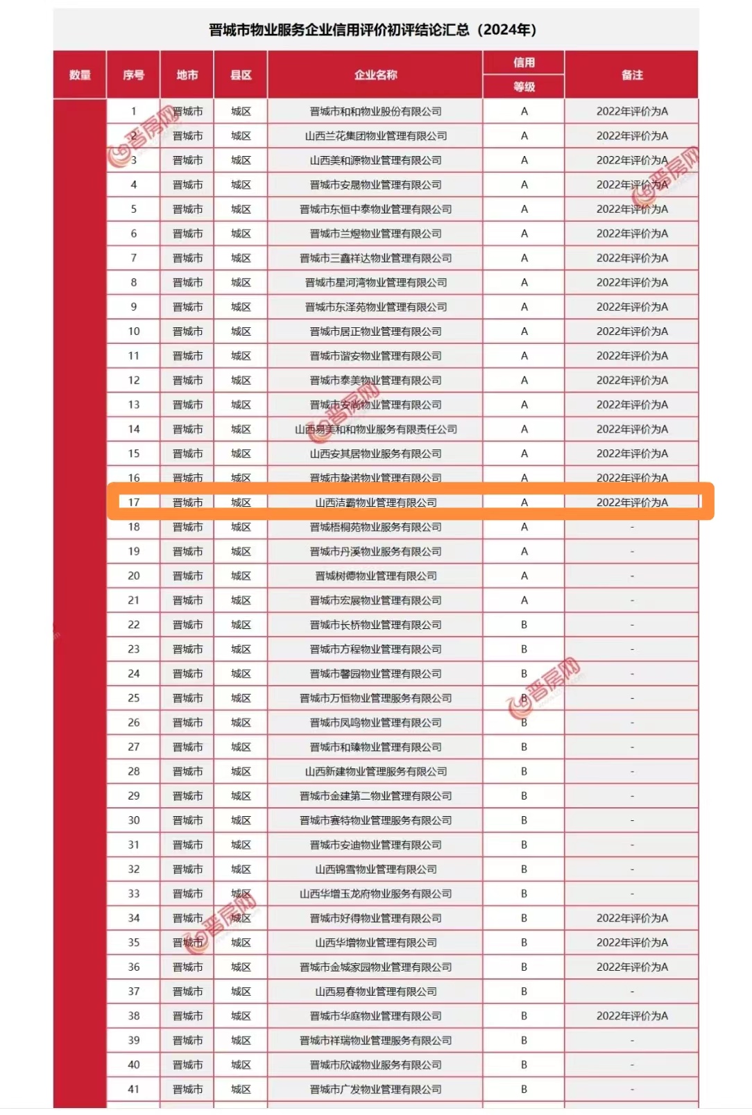 日前,山西省住房和城鄉(xiāng)建設廳發(fā)布了2023年度房地產(chǎn)企業(yè)信用評價結果的通知,根據(jù)通知顯示,晉城市共有200家物業(yè)服務公司參加評定,晉城市潔霸物業(yè)管理有限公司獲得2023年度物業(yè)服務企業(yè)信用等級A級認證。在本次考評結果中,潔霸物業(yè)光榮上榜,是對其物業(yè)服務品質(zhì)的充分肯定。 |