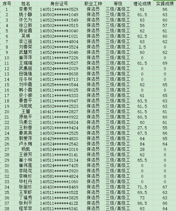 晉城市潔霸清潔服務(wù)股份有限公司職業(yè)技能等級(jí)認(rèn)定中心2024年9月1日第36批保潔員高級(jí)認(rèn)定人員成績公示