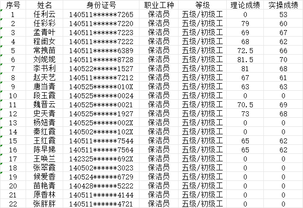 晉城市潔霸清潔服務(wù)股份有限公司職業(yè)技能等級(jí)認(rèn)定中心現(xiàn)將2024年9月15日認(rèn)定人員成績(jī)公示如下: