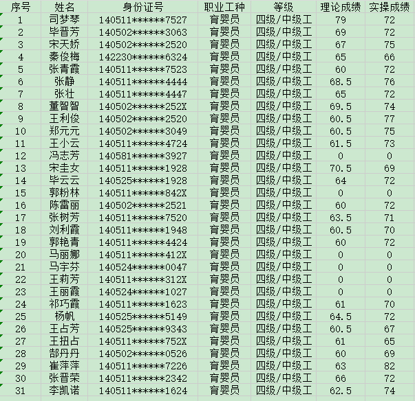 晉城市潔霸清潔服務股份有限公司職業(yè)技能等級認定中心2024年9月27日第10批育嬰員中級認定人員成績公示