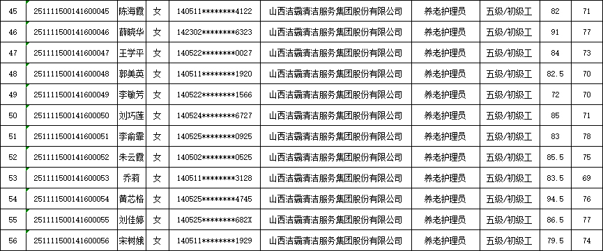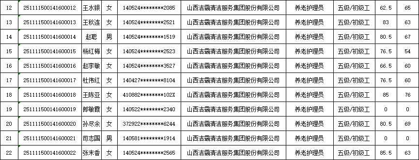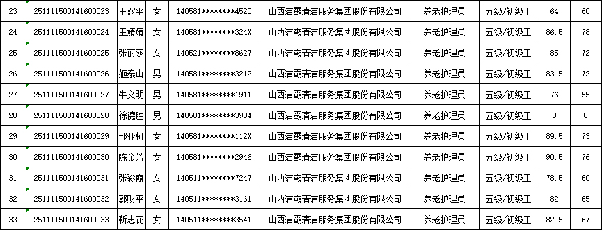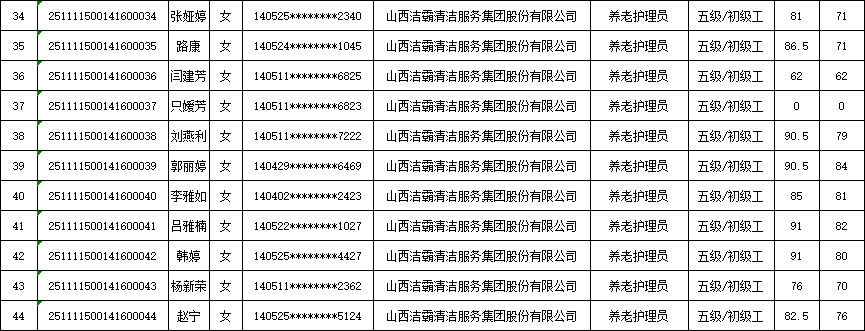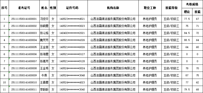 山西潔霸清潔服務集團股份有限公司職業(yè)技能等級認定中心2025年11月15日第3批養(yǎng)老護理員初級認定人員成績公示