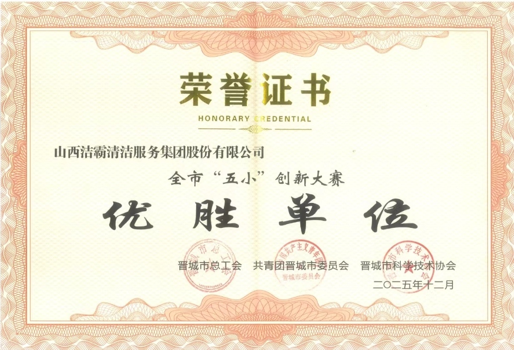 2025年8月,在2025年山西省“五小”創(chuàng)新大賽中,集團(tuán)山西潔霸智能科技有限公司經(jīng)理郭天研究的智慧清潔綜合管理平臺(tái)項(xiàng)目榮獲優(yōu)秀成果二等獎(jiǎng)。